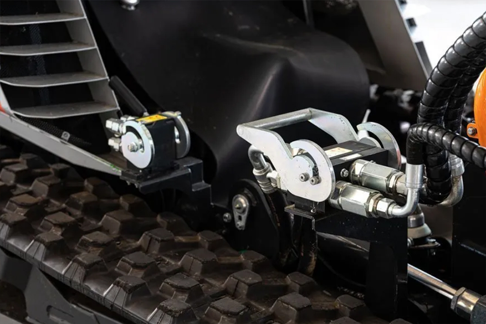 Sistem razširjanja gosenic, integriran v šasijo, omogoča prilagajanje širine stroja glede na razmere na terenu, kar izboljša stabilnost, ne da bi pri tem ogrozil zaščito notranjih komponent.